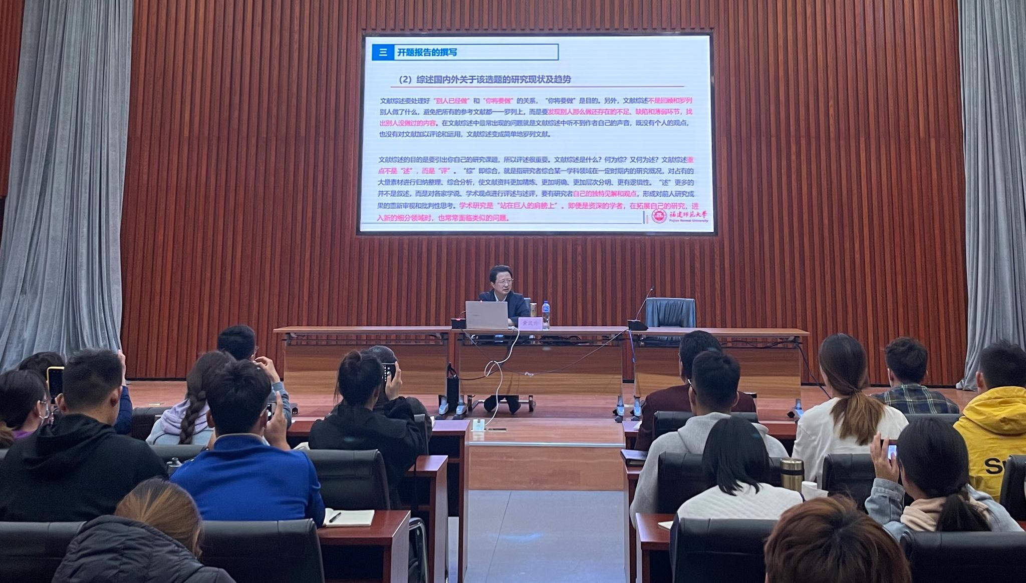 讲座中,黄汉升教授针对撰写开题报告的学术规范和提升方法等问题进行了系统而深入地讲解。黄汉升教授指出,开题报告是对学位论文选题是否恰当、资料是否翔实全面、对国内外研究现状是否了解、是否具有开拓性和创新性的学术考查,也是对研究生科研能力和科研水平的双重检验。黄汉升教授讲到,开题报告不是回答“是什么”,而是回答“为什么”,要有鲜明的问题意识;撰写开题报告的重点和难点在于做好文献综述,研究生要在学习过程中有意识地训练做好文献综述的能力。