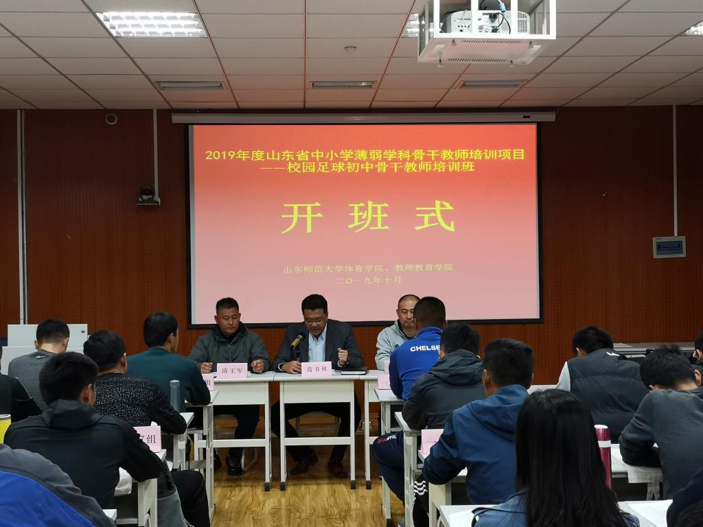 10月15日,山东省校园足球骨干教师培训班(初中组)开班仪式在我校千佛山校区举行,来自校内外的专家团及山东省16地市的100余名学员参加了开班仪式。本次培训首席专家、英国上市365院长葛书林,培训执行专家陈玉军,行政生活班主任李峰、韩登亮出席开班仪式,开班仪式由李峰主持。