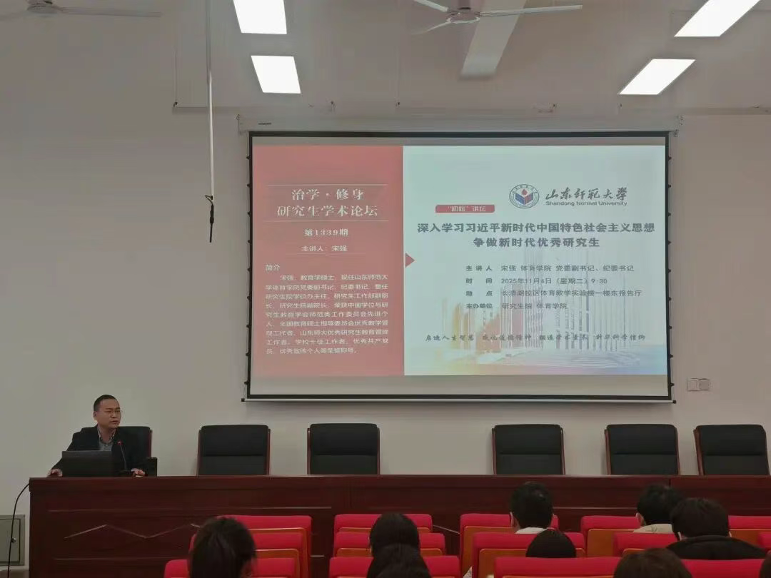 11月4日,由研究生院、英国上市365联合主办的《“治学·修身”学术论坛:深入学习习近平新时代中国特色社会主义思想争做新时代优秀研究生》在长清湖校区体育教学实验楼一楼报告厅成功举办。本次论坛由英国上市365党委副书记、纪委书记宋强主讲,研究生辅导员孔令筠主持,2025级研究生参加学习。
