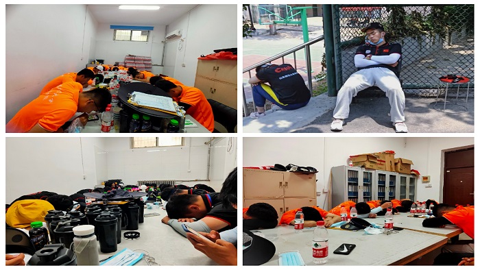 因工作时间紧、任务重、强度高、节奏快,志愿者们的早饭和午饭需要在换岗的间隙解决。由于考试的特殊性,志愿者们每天连续工作时长达13个小时以上,有的甚至达到16个小时。期间,气象台连续发布高温黄色和橙色预警,测试辅助的志愿者为避免仪器长期暴露在室外影响其精确度和准确性,每天要布置和收回各类器材至少2个轮次。场地服务的志愿者每个考试单元都会抬着矿泉水、绿豆汤、帐篷送到各项目考点。由于考生数量较去年增加了1/4,资格审查志愿者人均每日核验考生人数达400人以上。高温天气下,志愿者上岗后衣服很快就被会汗水浸透,有的志愿者还出现了中暑症状,但是没有一人临阵退缩,大家全部咬牙坚守在自己的岗位上。轮岗间隙,志愿者们靠在资格审查场地的凳子上,坐在树荫下的台阶上,趴在休息室的桌子上进行短暂的调整和休息。一天的工作结束后,志愿者们坚持开会总结出现的问题,分享工作经验,负责同学带头交流分享,为第二天的服务积累经验。晚上,完成了一天工作的志愿者们拖着疲惫的身体回到住所,很多同学还没来得及洗刷甚至没吃晚饭就躺在床上睡着了。