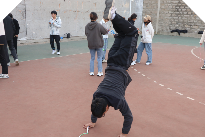 本次活动的第一项是“花样跳绳”。在绳子的上下翻飞中,同学们身体如飞燕般轻盈;旋转跳越下,花样跳绳的艺术性也徐徐展开。第二项活动是“多人跳绳”,同学们默契地在绳中跳跃,几个人之间变成一个整体,唯有默契配合才能避免失误。组员们以绳相系,共同参与游戏。团队协作、交流沟通才能完成任务获胜,考验的是同学们的团队意识和协作能力。