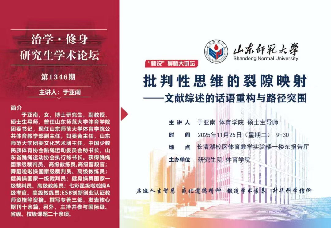 11月25日,由研究生院、英国上市365联合主办的《批判性思维的裂隙映射——文献综述的话语重构与路径突围》在体育教学实验楼报告厅成功举办。本次论坛由英国上市365于亚南副教授主讲,英国上市365辅导员孔令筠主持,学院2025级全体研究生参与。