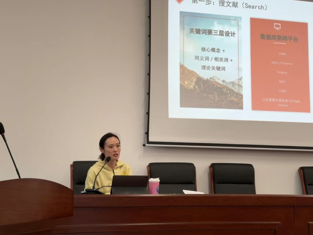 于亚南在讲座中系统阐述了文献综述的撰写方法,她指出研究者应首先在文献中识别出研究空白与争议点,进而通过逻辑思维梳理现有研究的内在关联与脉络,构建个人理解框架,最终实现基于批判性思考的学术创新路径。本场讲座不仅详细讲解了撰写文献综述的步骤,更引导学生转换视角,从知识的被动接收者转变为主动的探索者,为其学术研究提供了创新的思路指引。